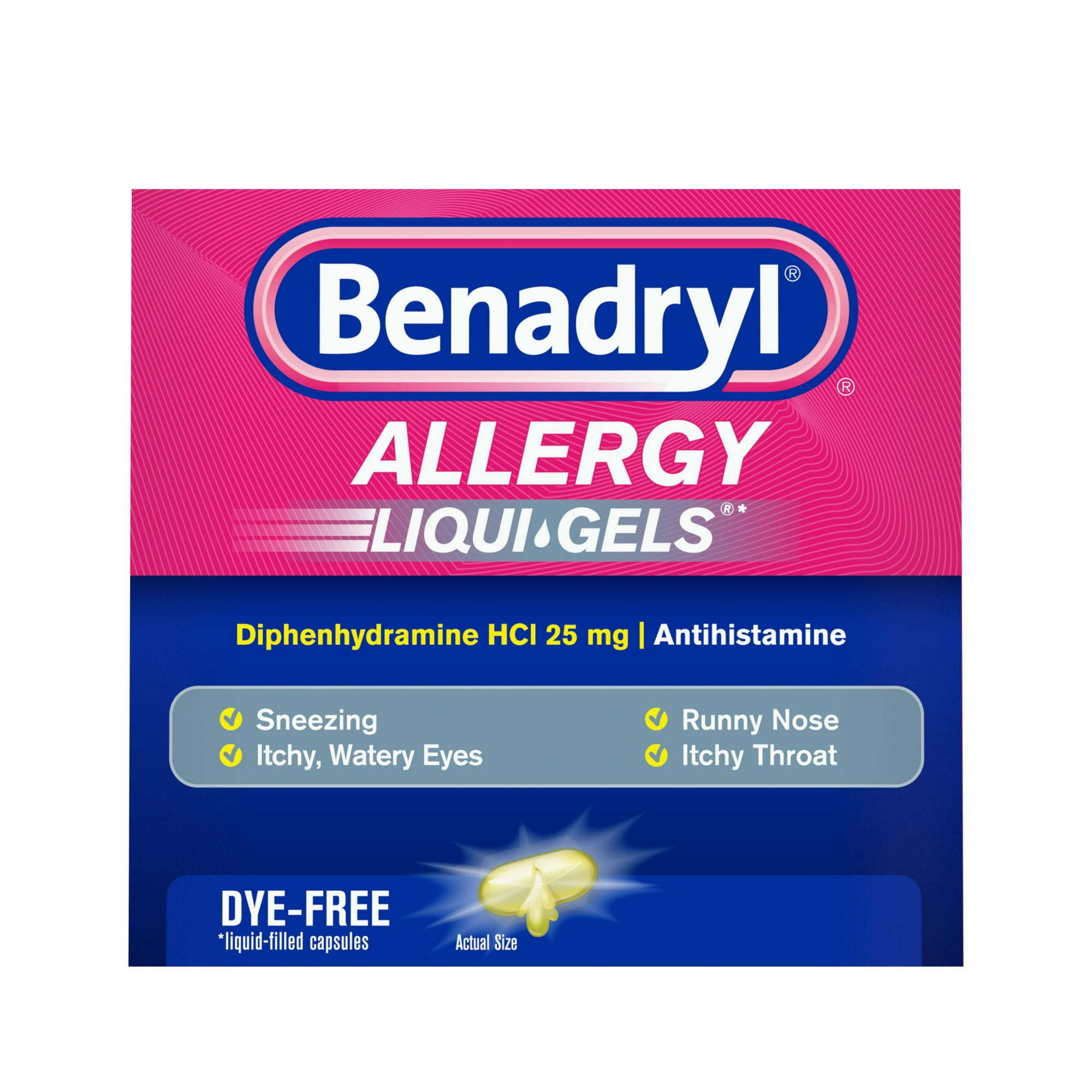 Allergies can hit fast. Get powerful relief with Benadryl Dye-Free Liqui-Gels Antihistamine Allergy Medicine that temporarily relieves the allergy symptoms associated with hay fever or other upper respiratory allergies caused by common allergens such as pollen; dust mites; mold; and pet dander; as well as symptoms of the common cold. Free of dyes; each of these liquid gels contains 25 mg of the antihistamine diphenhydramine HCl to temporarily treat allergy symptoms such as sneezing; runny nose; itchy nose or throat; and itchy; watery eyes; and cold symptoms such as sneezing and runny nose. Effective relief day or night; this allergy medicine is safe and effective; when used as directed; and has a dye-free formula. From a doctor-recommended brand; Benadryl liquid capsules are intended for adults and children ages six and up to relieve indoor and outdoor allergy symptoms and cold symptoms.