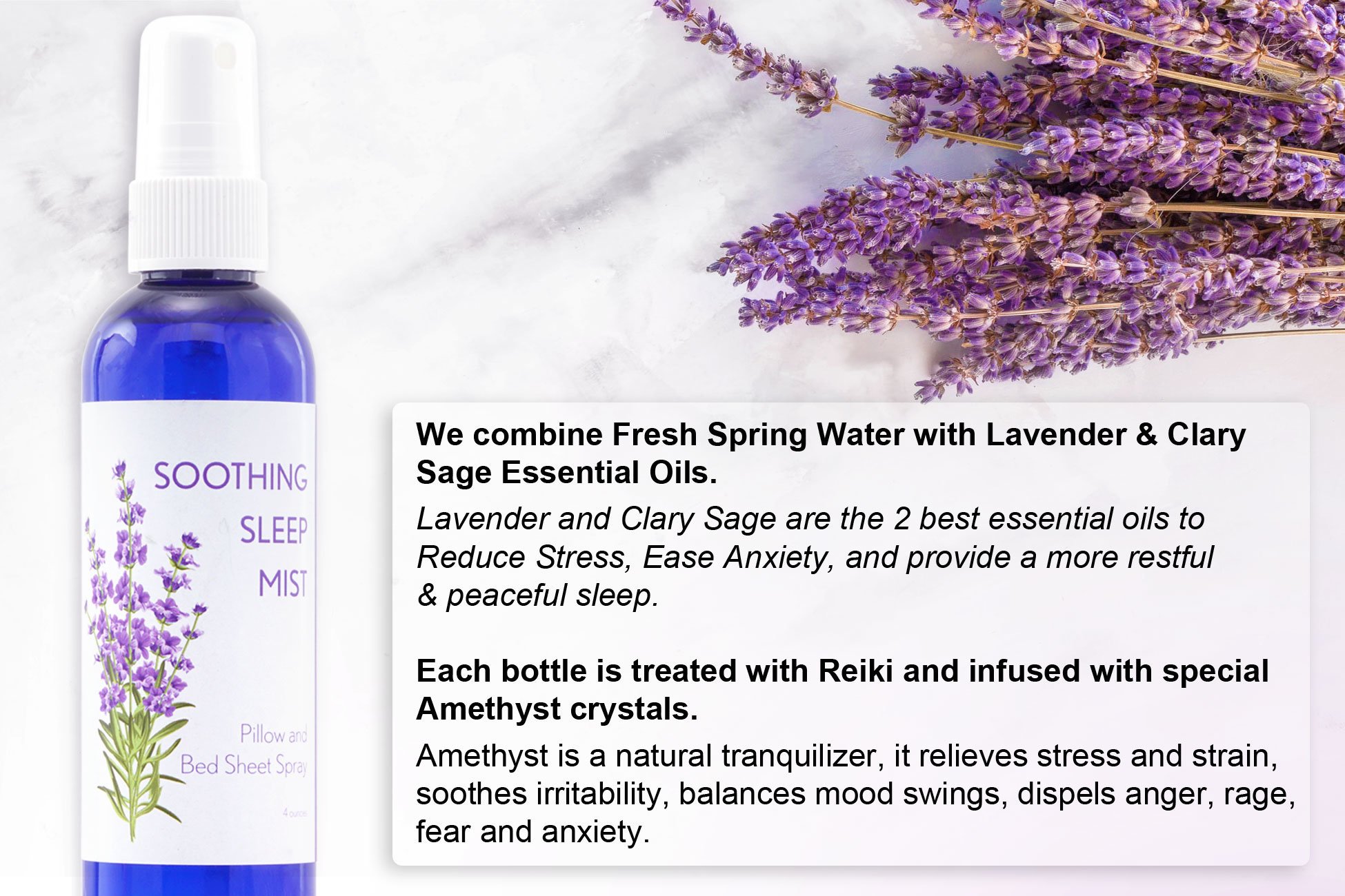8 ounce spray mister. Designed for better sleep; our Soothing Sleep Mist is hand-crafted in the United States with 100% pure ORGANIC essential oils of Lavender and COMPLIMENTING ESSENTIAL OILS; Amethyst Crystals and Reiki charged. Carefully formulated to ensure you get the best sleep possible. These oils and Amethyst crystals are well known for their calming effect; ability to promote restful sleep and alleviating anxiety and stress. See how sleep can be effortless and easy once again with our Soothing Sleep Mist! PLEASE NOTE WE ONLY USE ORGANIC ESSENTIAL OILS. WE ONLY USE PURE UNTREATED NATURAL SPRING WATER; NOT CITY CHLORINATED TAP WATER AS DO MOST OTHER COMPETITORS. (cap color may vary)